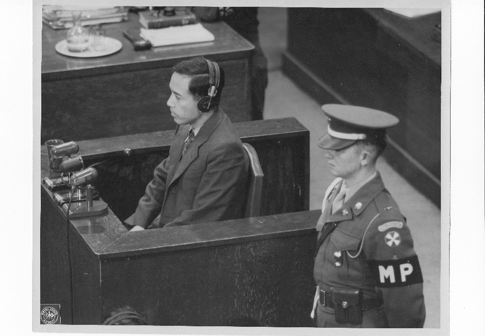 1947.10.28 东京审判: 远东国际军事法庭25名日本被告A级战犯庭审中,关东军总部密码处负责人松浦九州男出庭作证。 拍摄—Tsukano 照片由美国陆军通讯部队提供 通讯部队官方照片 复制时请注明来源—美国陆军通讯部队