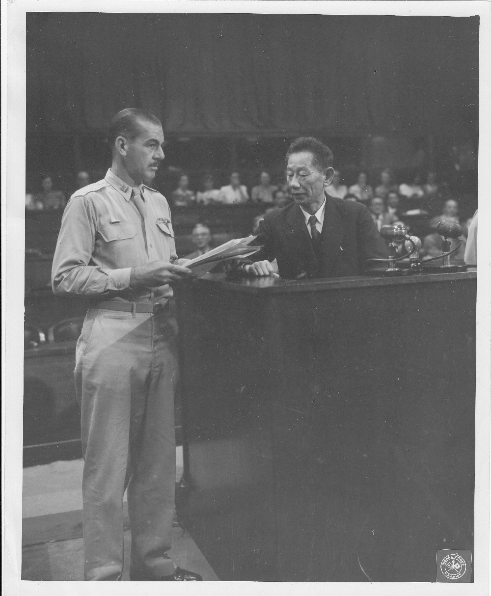 18 SEPT. 47 IMTFE WAR CRIMES TRIALS IN TOKYO: Kingoro Hashimoto, former Japanese Colonel of the 2nd Field Artillery in Aug., 1934, Commander of the Second Heavy Field Artillery regiment at Mishima, and commander of a heavy artillery regiment in North and Middle China till April 1939, after which he was transferred to the reserve list, takes the stand before the International Military Tribunal for the Far East, Tokyo, Japan, during the War Crimes Trials of the 25 alleged Japanese war criminals. Standing beside him is Capt. D. S. Van Meter, Marshal of the Court. Photographer—Brooks Photograph by U.S. Army Signal Corps OFFICIAL SIGNAL CORPS PHOTO Reproduction prohibited unless credit line is given to Signal Corps, U.S. Army.