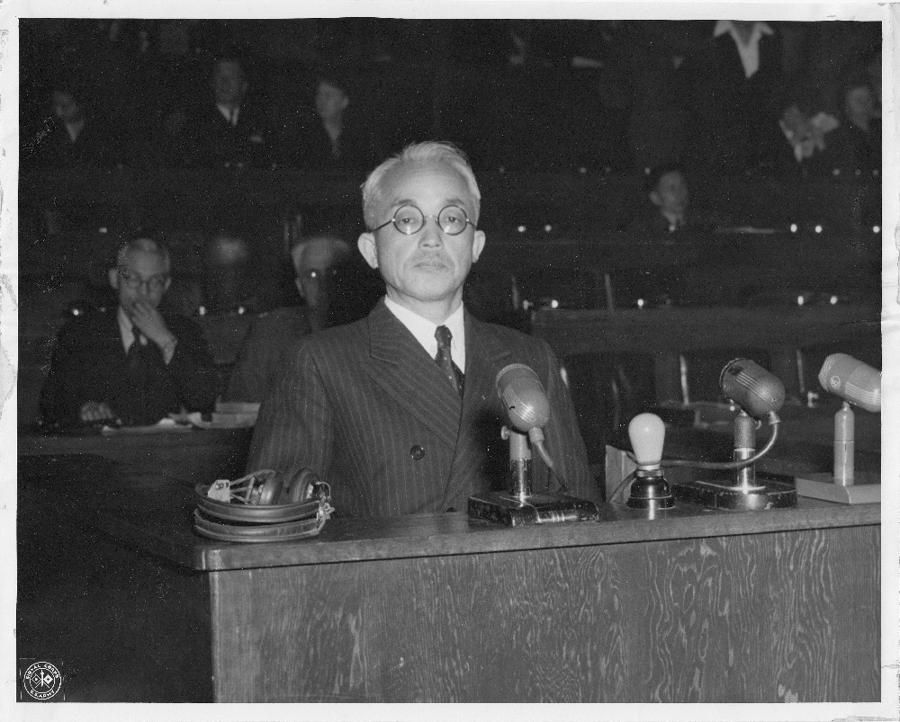 21 NOV. 47 IMTFE WAR CRIMES TRIALS IN TOKYO: Yukio Hasahara, former General in the Japanese Army, appears on the witness stand at the International Military Tribunal for the Far East, Tokyo, Japan, to testify in the defense of the accused Hiroshi Oshima, one of the 25 alleged major Japanese war criminals on trial there. Photographer—Van Galen Photograph by U.S. Army Signal Corps OFFICIAL SIGNAL CORPS PHOTO Reproduction prohibited unless credit line is given to Signal Corps, U.S. Army.