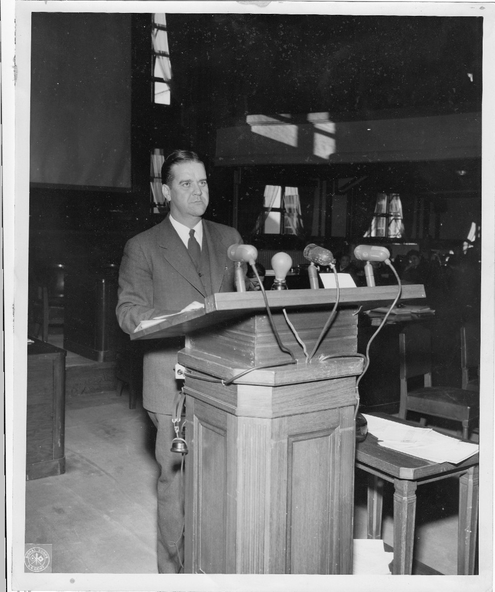 11 DEC. 47 DEFENDS MAJOR JAPANESE WAR CRIMINAL: Charles B. Caudle, of Wadeboro North Carolina, defense attorney, is shown at the lectern of the International Military Tribunal for the Far East, Tokyo, Japan, defending Toshio Shiratoti, one of 25 alleged major Japanese war criminals on trial there.